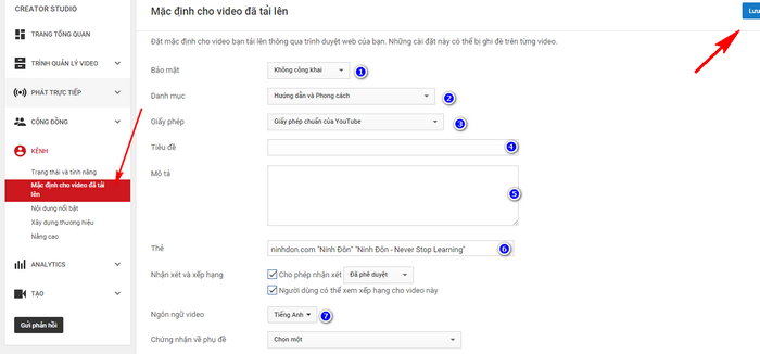 Để bắt đầu thực hiện, bạn vui lòng đăng nhập vào kênh và vào Dashboard của YouTube sau đó chọn Kênh ⇒ Mặc định cho video đã tải lên như hình: